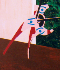 In contrast, the left hand side of the painting (above) is flattened through a lack of perspective cues. Noticeably, the top of the form is represented by a simple black rectangle being the edge of the timber Centaur form that merges with the surrounding green background. This deliberate alignment of the form perpendicular to the viewer hides a key element for identifying the Centaur form (the upper body and head of the centaur). This not only makes the form unrecognisable, it may confuse the viewer into questioning what the form actually is, as well as which end is the front and which is the rear. Also, the 'feet' of the Centaur appear to be surrounded by the brown surface as you might expect of a 2D image.